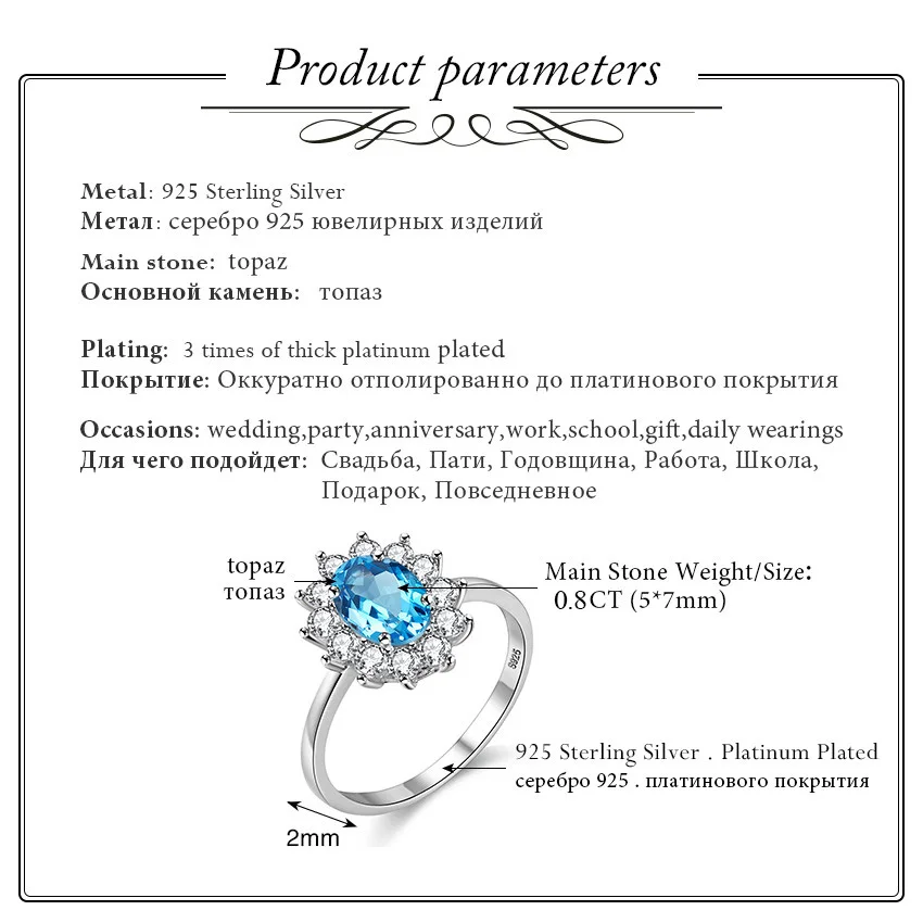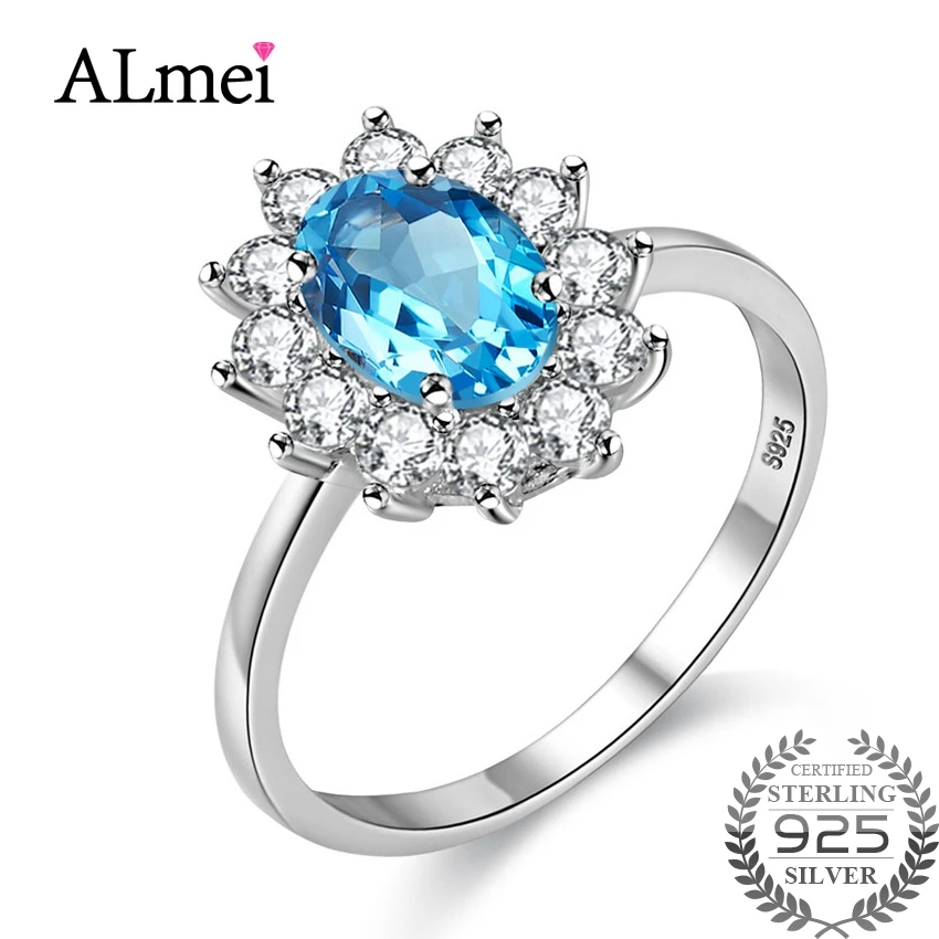 Almei Blue Topaz Diana Wedding Ring for Bridal Female Genuine 925 Sterling Silver Flower Costume Je