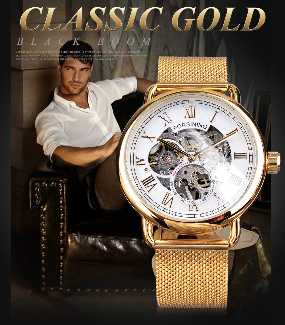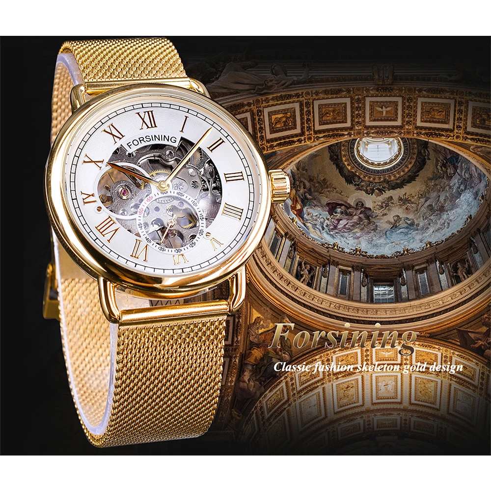BEST SELLER Forsining 2019 Mens Mechanical Watches Top Brand Luxury Classic Golden Mesh Band White Small Dial W