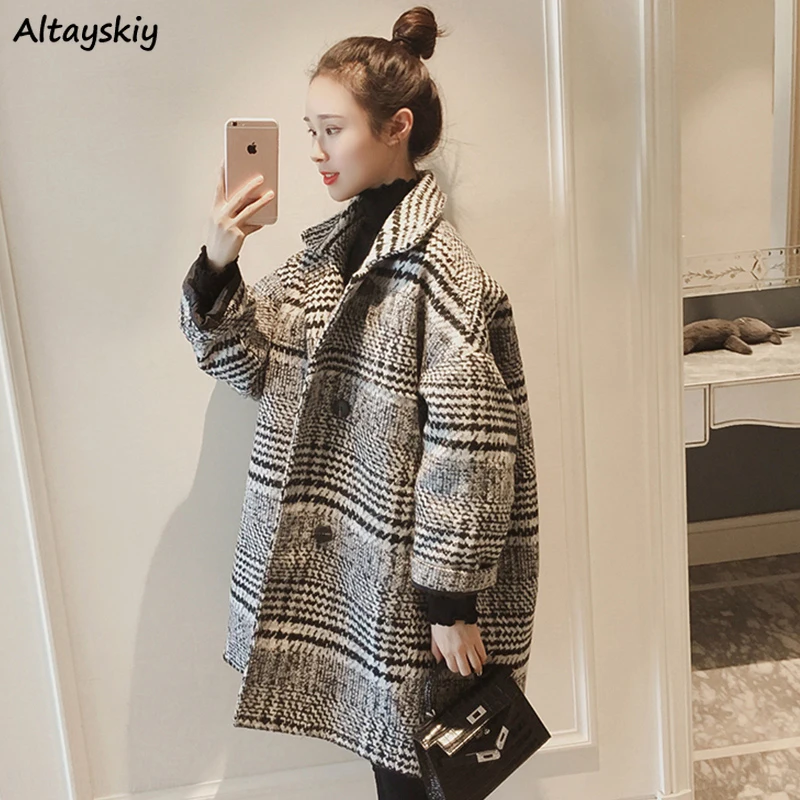Woolen Coat Women Winter Classic Plaid Mid-long Outwear Womens Pockets Chic Loose 2XL Harajuku Kore